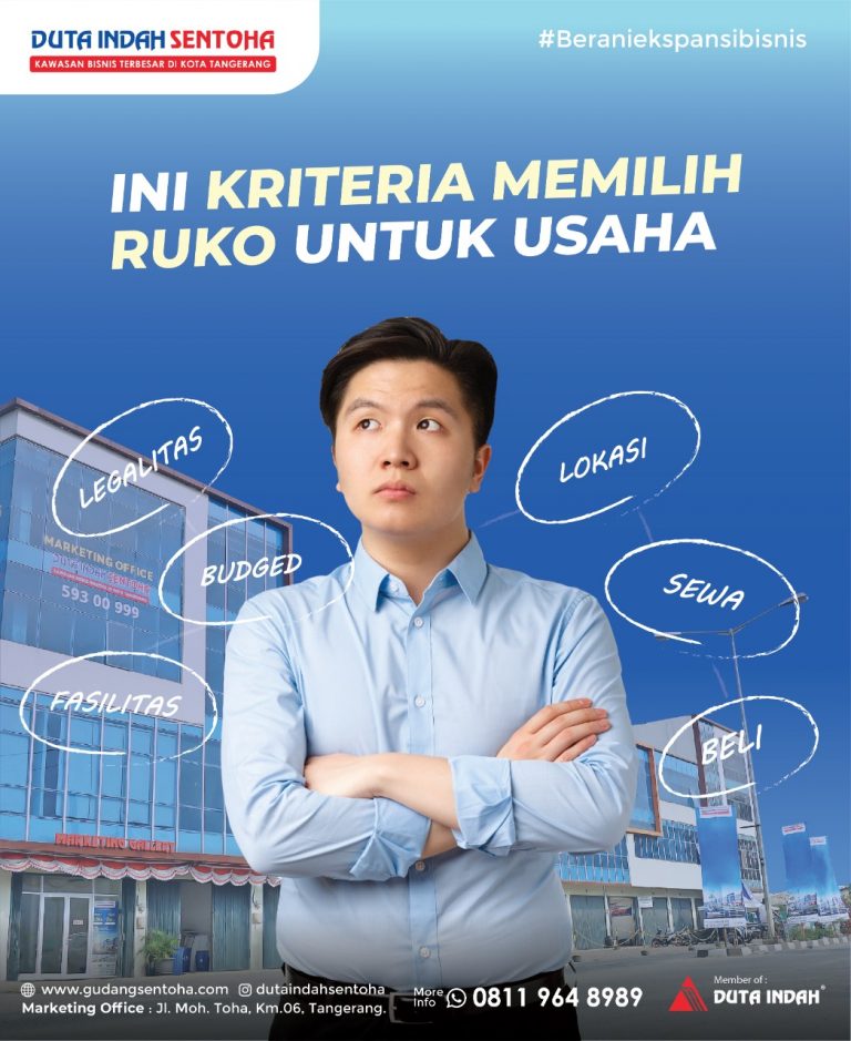 Nah, salah satu ruko dengan kriteria yang baik dimiliki oleh Duta Indah Sentoha! Pilih ruko terbaik di Duta Indah Sentoha, kawasan peruntukan industri yang mengedepankan konsep Gudang Multiguna 3 in 1 dimana gudang, kantor, dan hunian menyatu dalam satu unit bangunan yang sama. Kunjungi Marketing Gallery Duta Indah Sentoha di Moh. Toha, Tangerang untuk mendapatkan promo menarik dari Duta Indah Sentoha setiap pembelian Ruko dan Gudang Multiguna!
